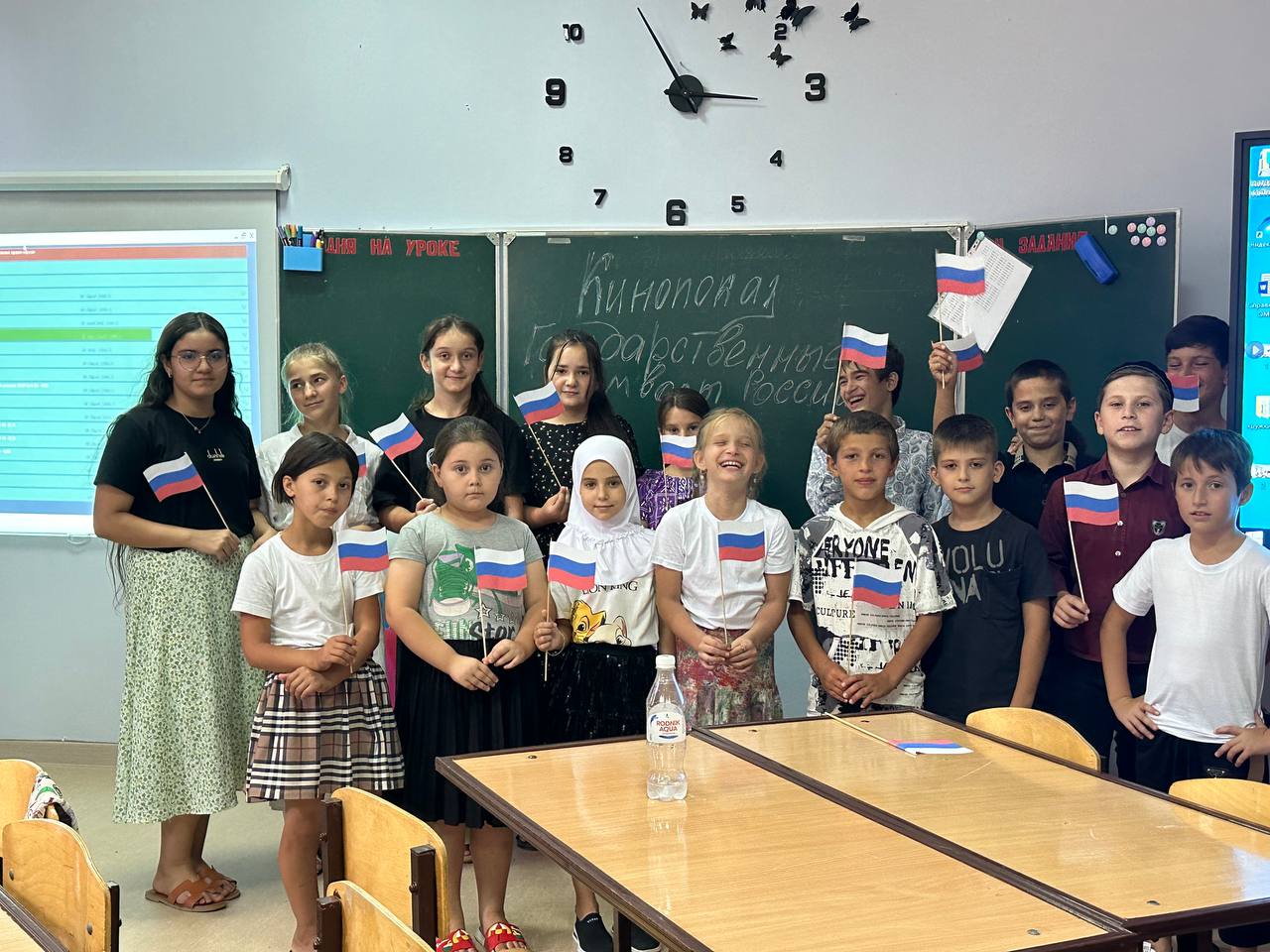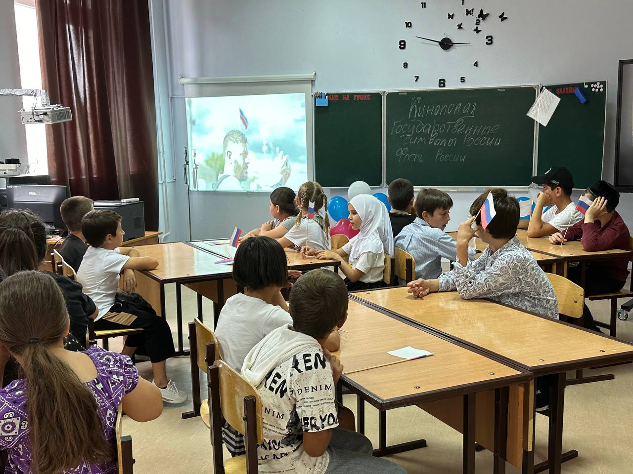 15 августа 2024 г. учащиеся МБОУ «СОШ им. Я.У. Эсхаджиева с. Толстой-Юрт» приняли участие в тематическом кинопоказе посвященном Дню государственного флага Российской Федерации. Ребята просмотрели фильм «Флаг России», входящий в трилогию «Государственные символы России»